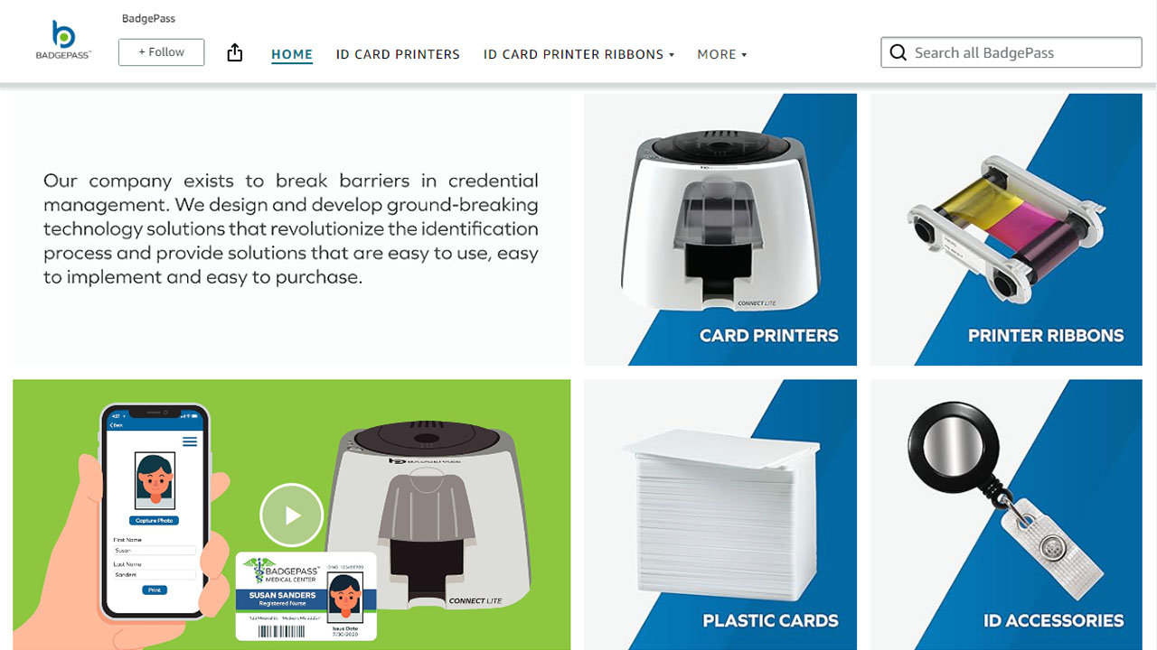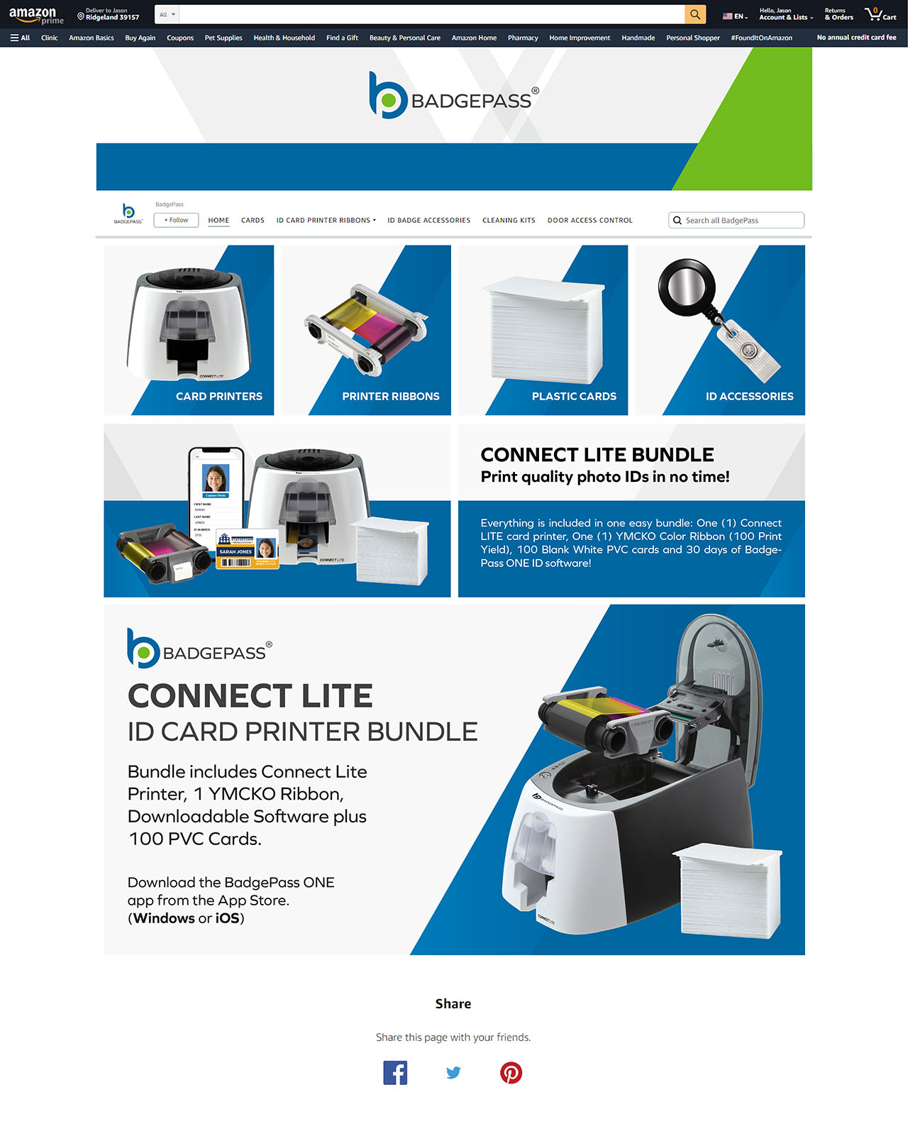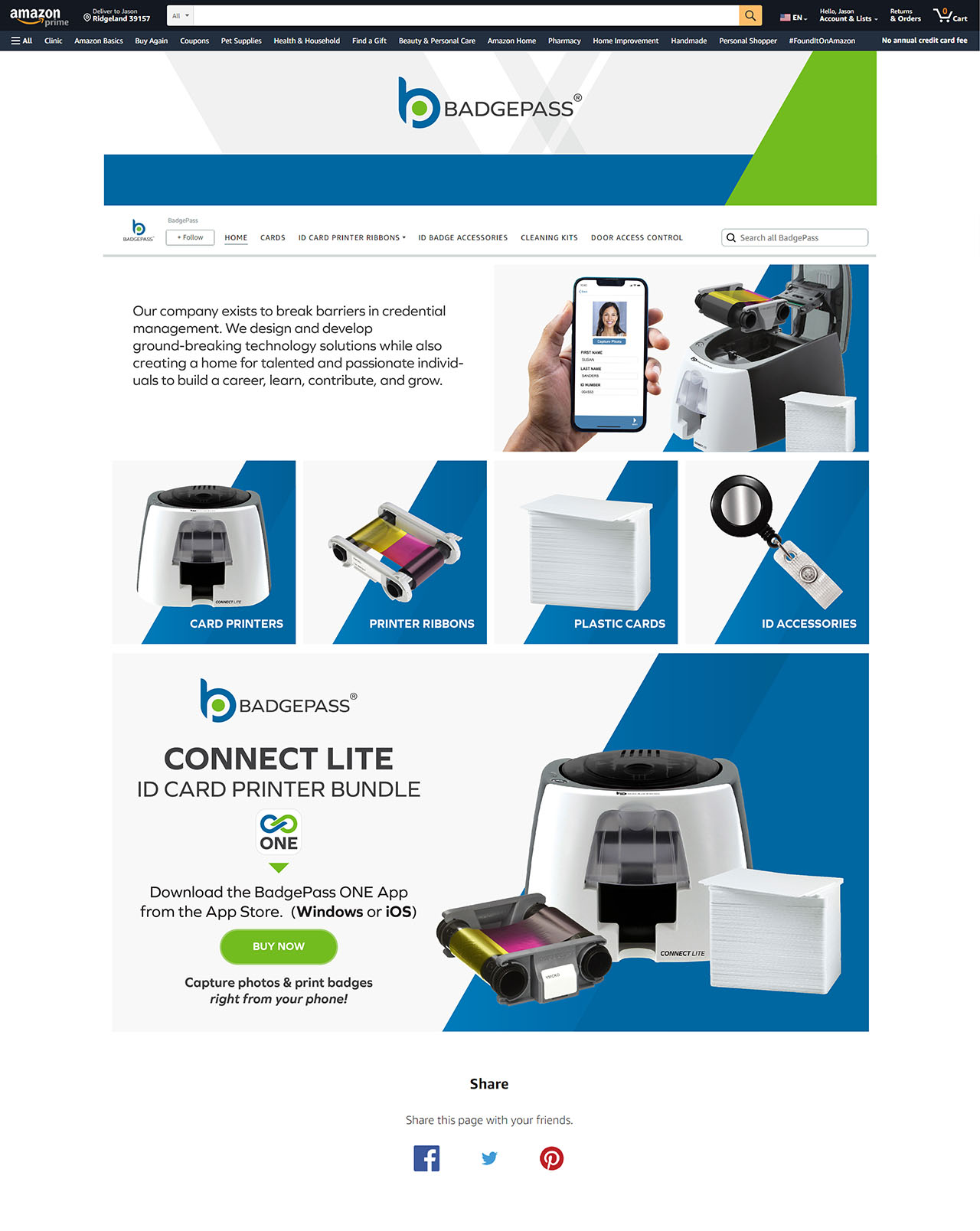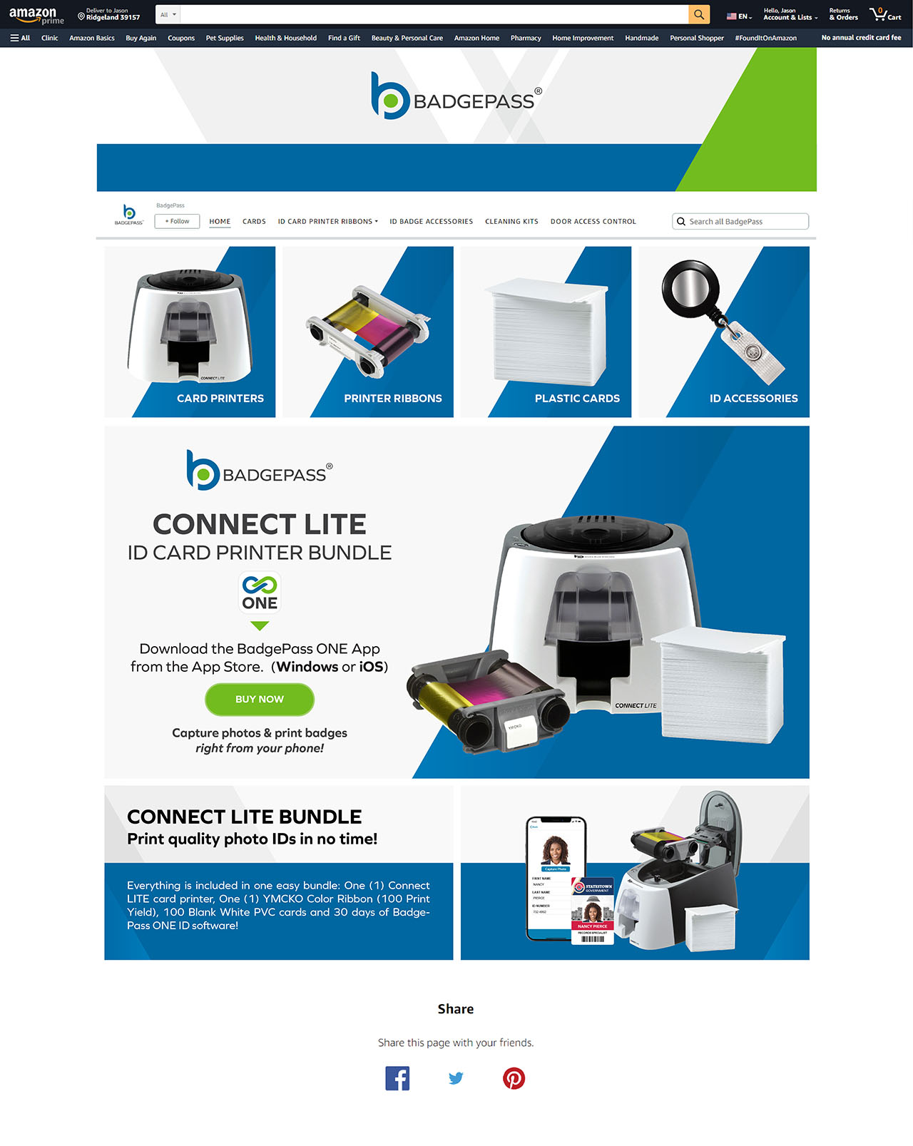 Objective: In 2022 there was an initiative to push a printer, that was rebranded as the ConnectLITE, along with an accompanying application – BadgePass ONE, via Amazon’s ecommerce foundation. A layout for the storefront had to be put together that was consistent with BadgePass’ visual identity.