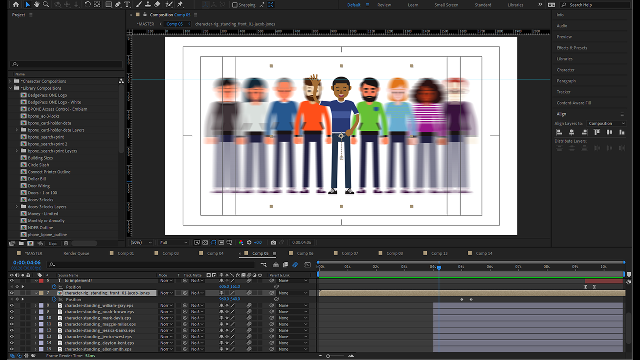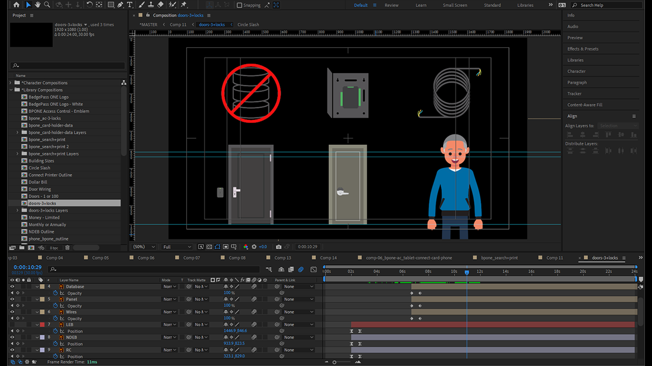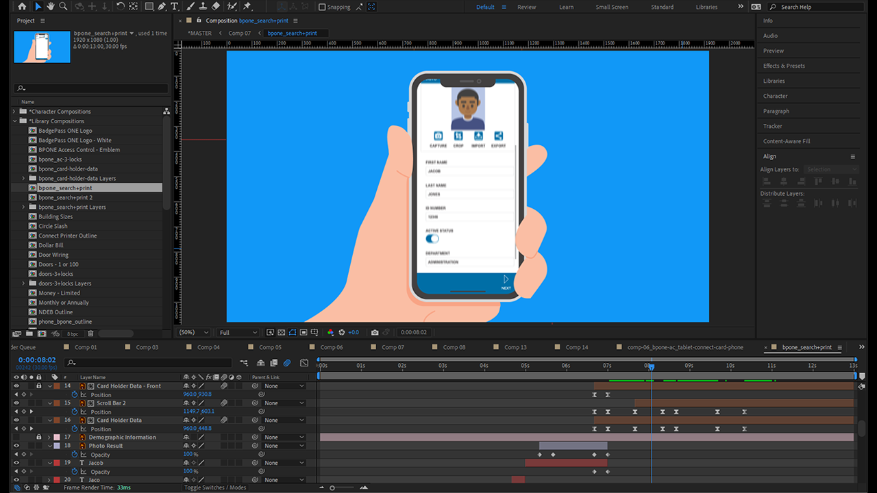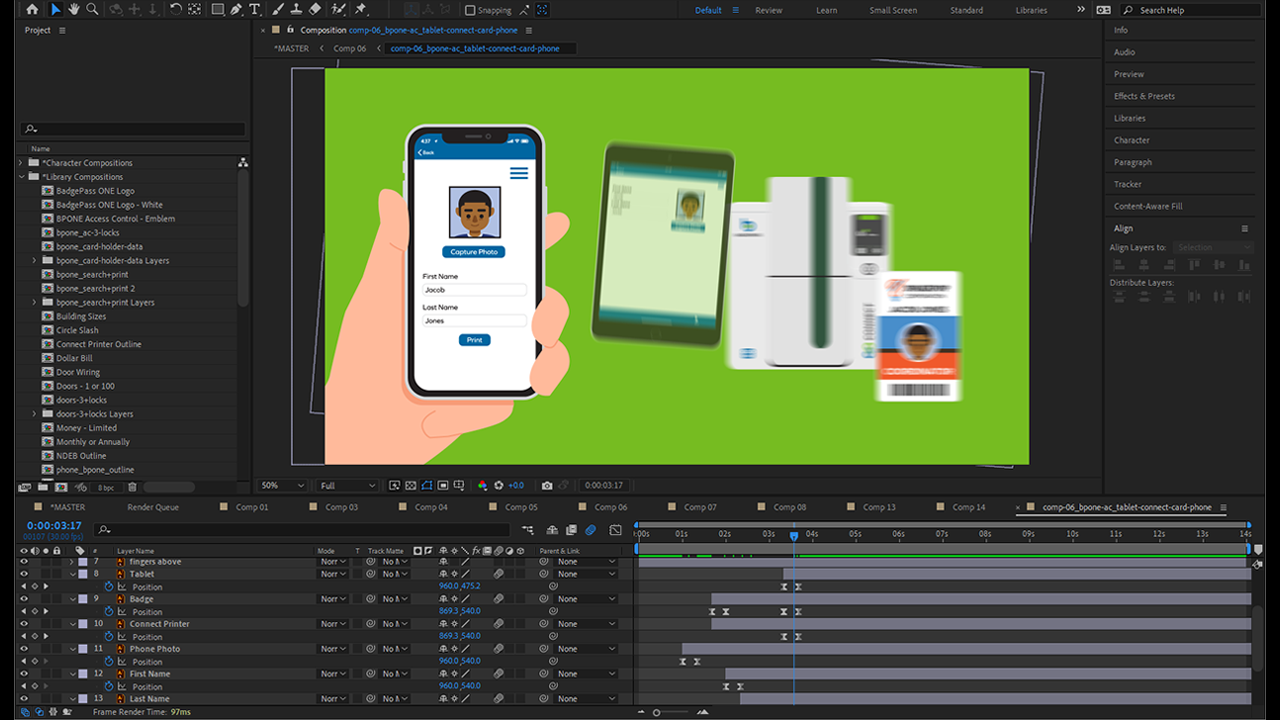 Approach: There are 2 versions of Access Manager, an Enterprise version and a mobile solution version, this video highlights the mobile solution version available in BadgePass ONE. Video project started with its usual process with storyboards from the project owner, storyboard sketches then referenced for the vector assets and from there those assets are imported into Adobe After Effects. Narration is typically the final piece to be added to the project.