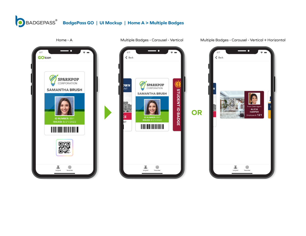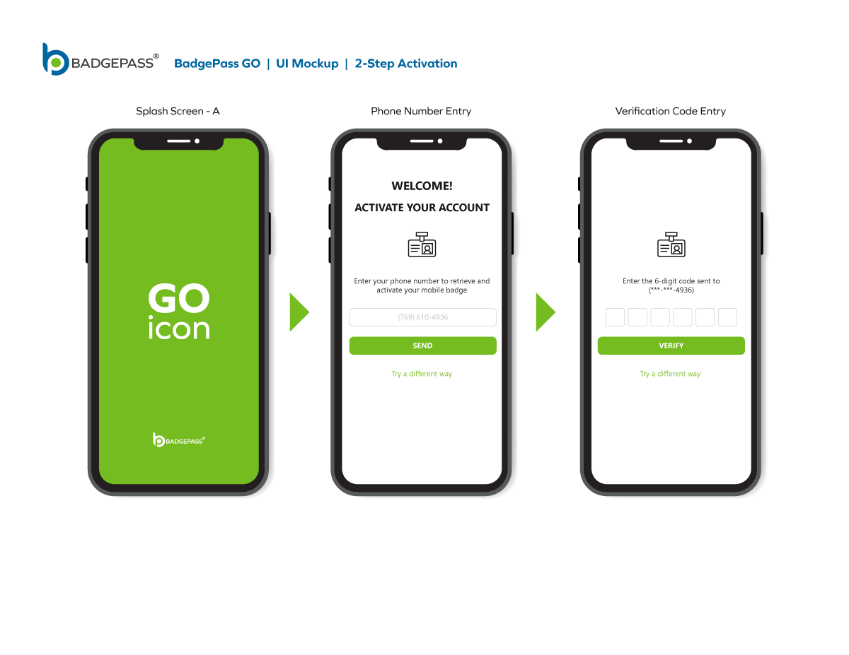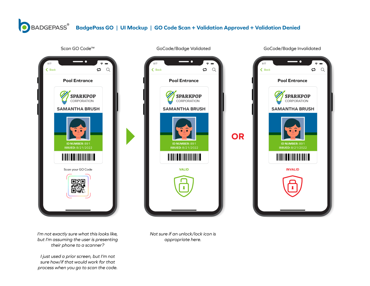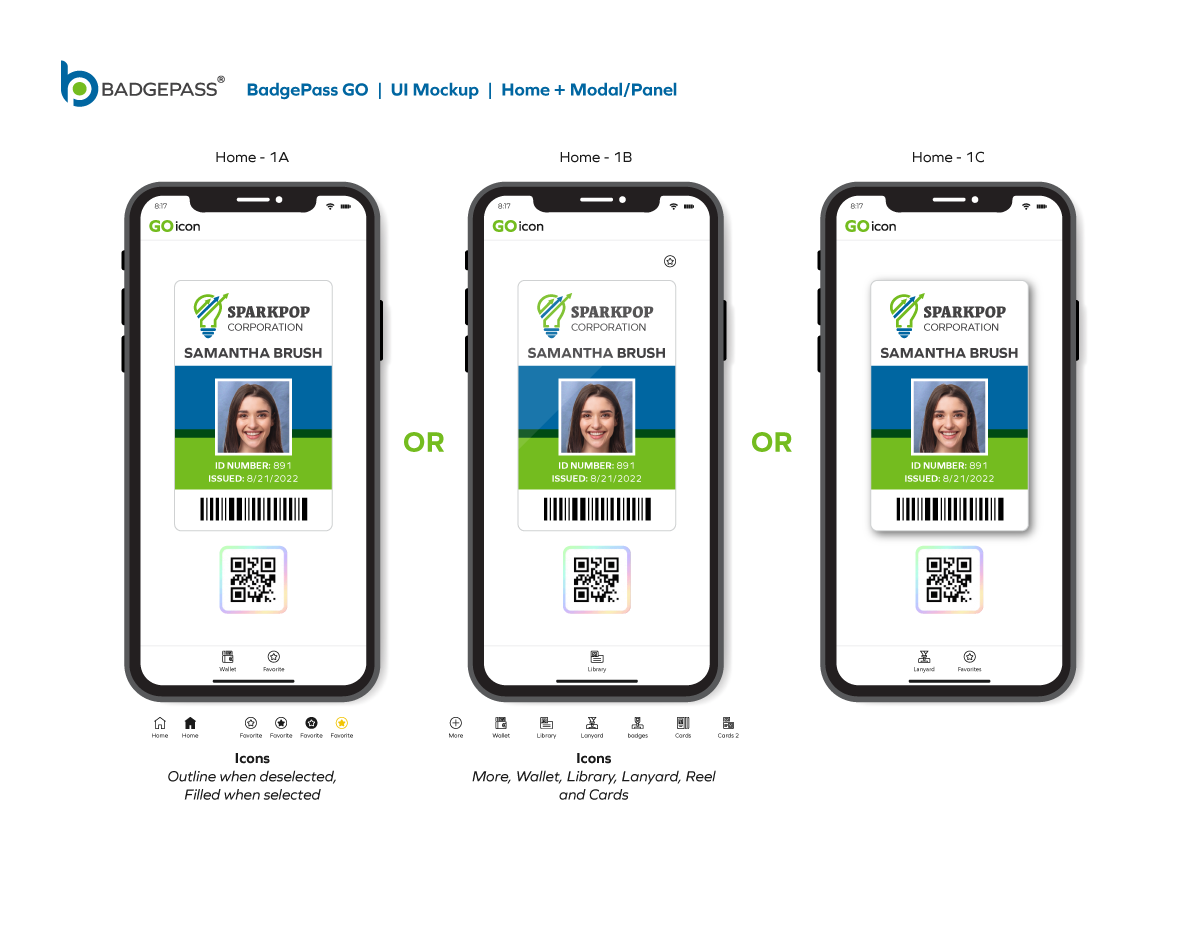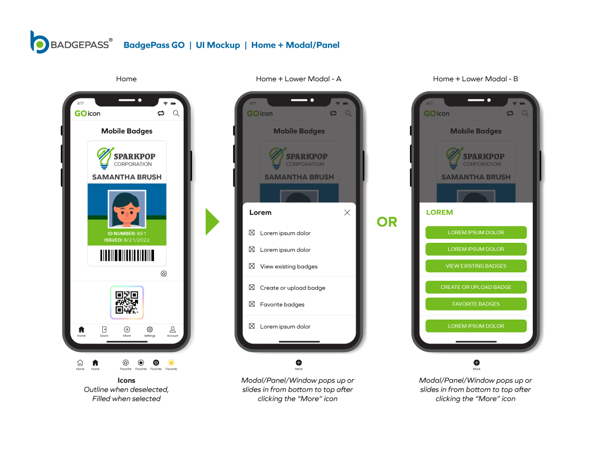 Results: Clean and contemporary mobile UI mockup, that consisted of the primary windows and navigation to efficiently get around the, app was created. It was a collaborative, back-and-forth process between myself, the product owners and the software development team, but we managed to finalize a layout for BadgePass GO.