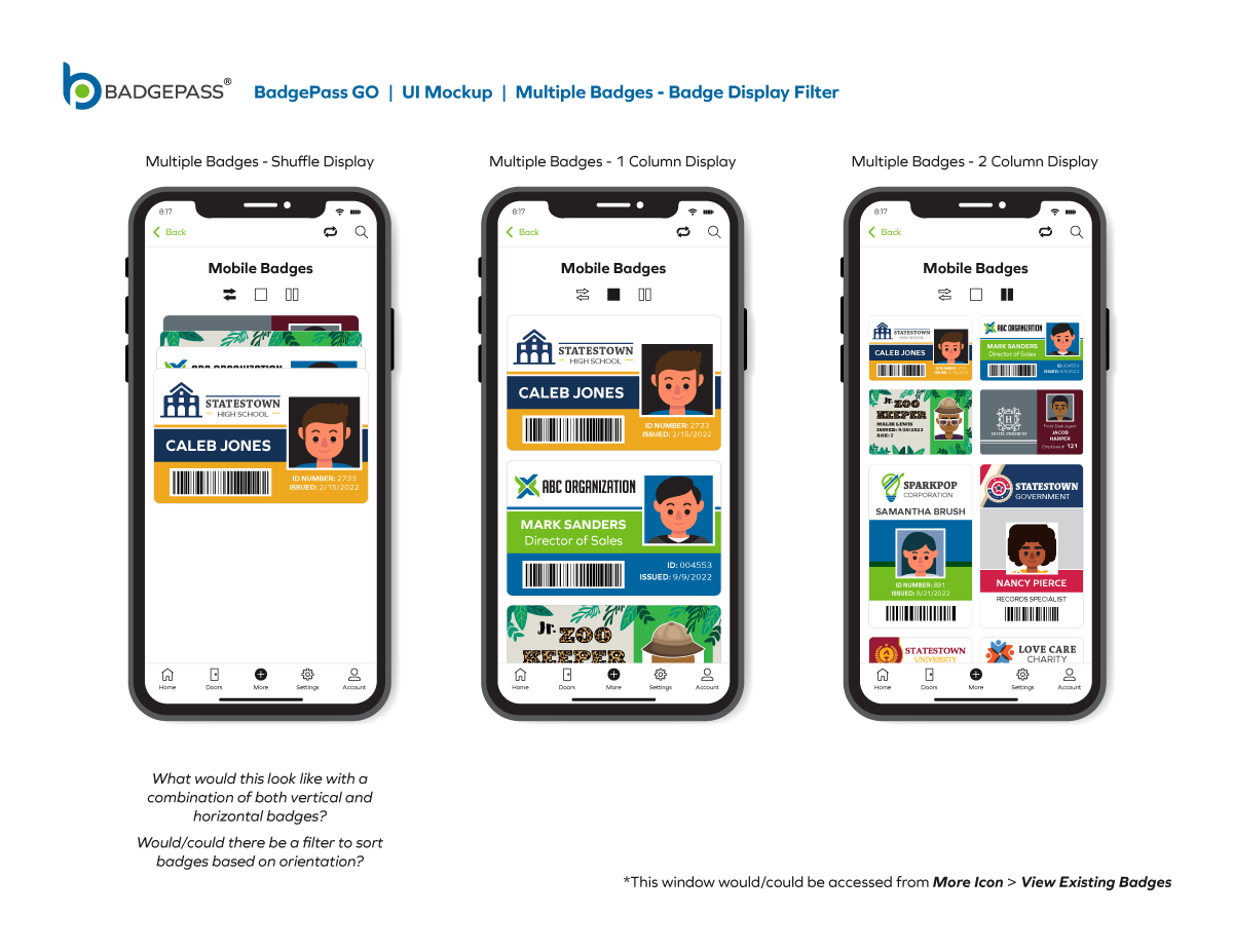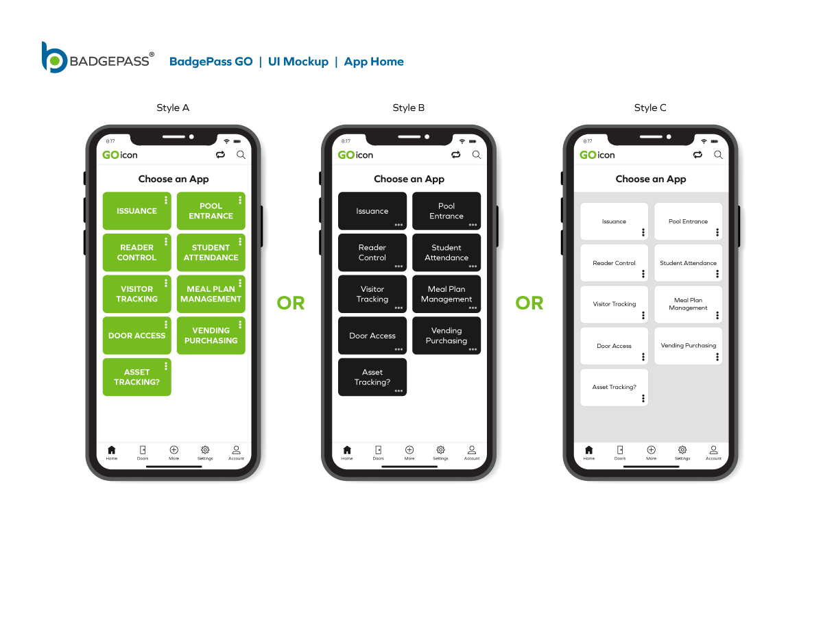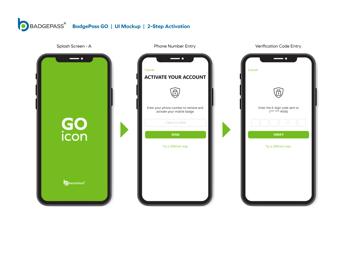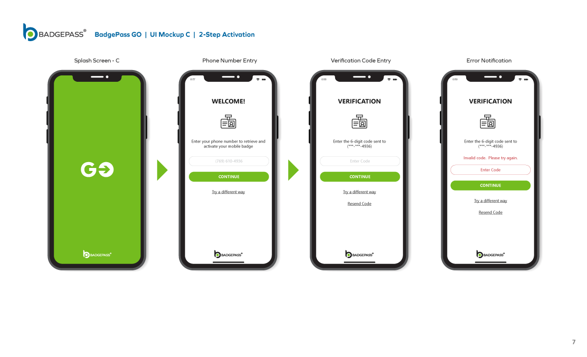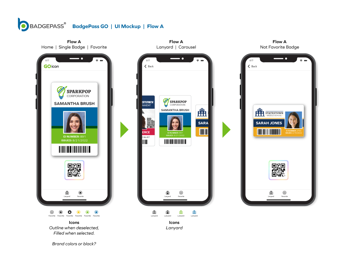 Results: Clean and contemporary mobile UI mockup, that consisted of the primary windows and navigation to efficiently get around the, app was created. It was a collaborative, back-and-forth process between myself, the product owners and the software development team, but we managed to finalize a layout for BadgePass GO.