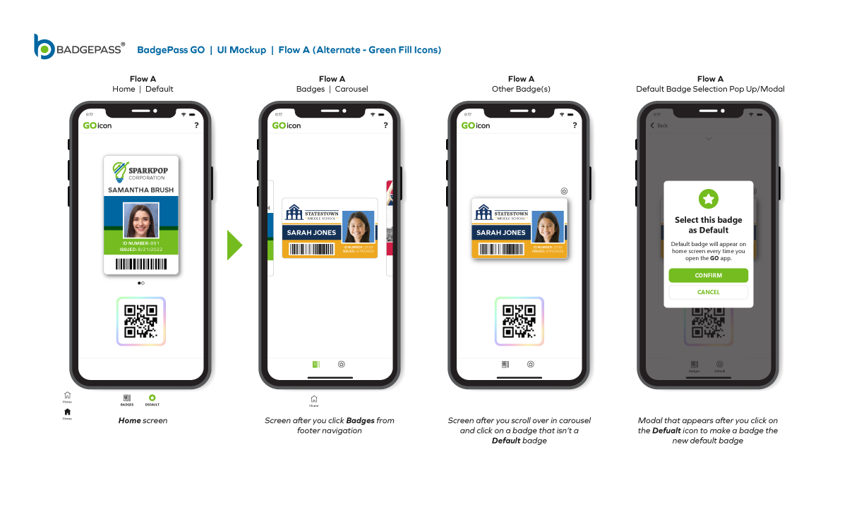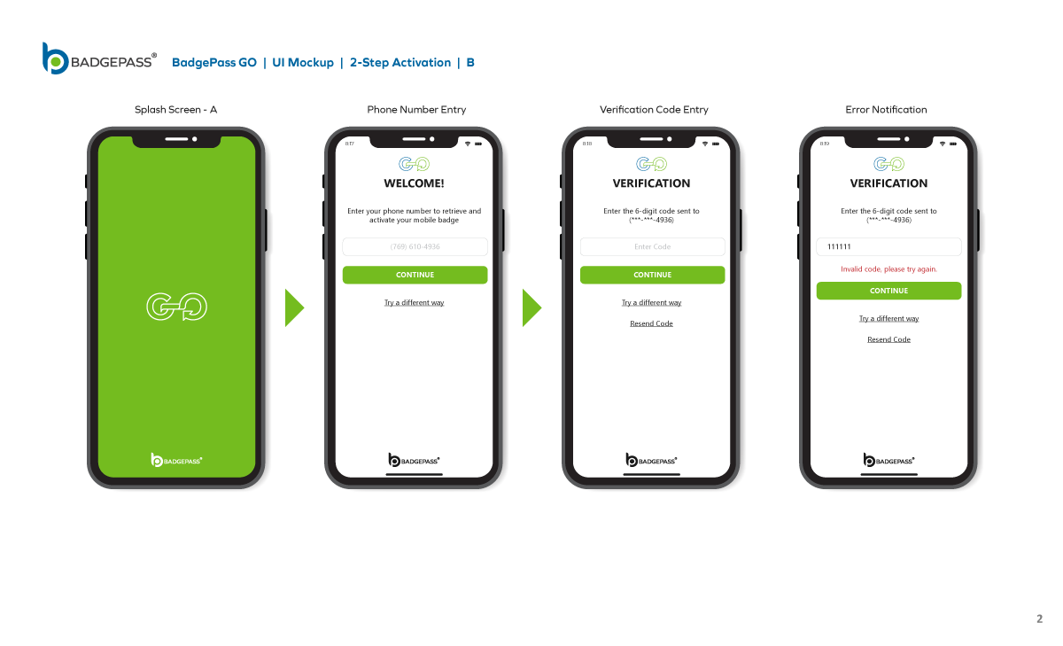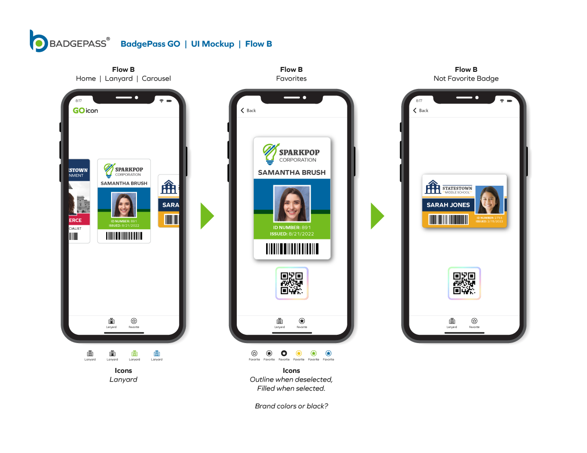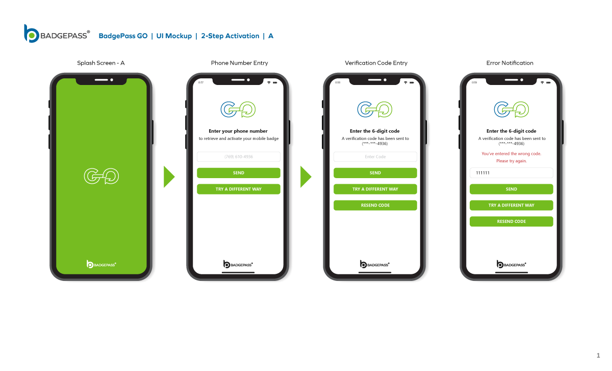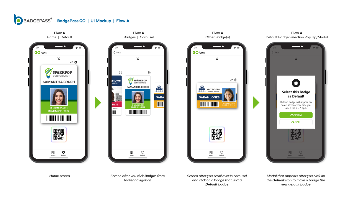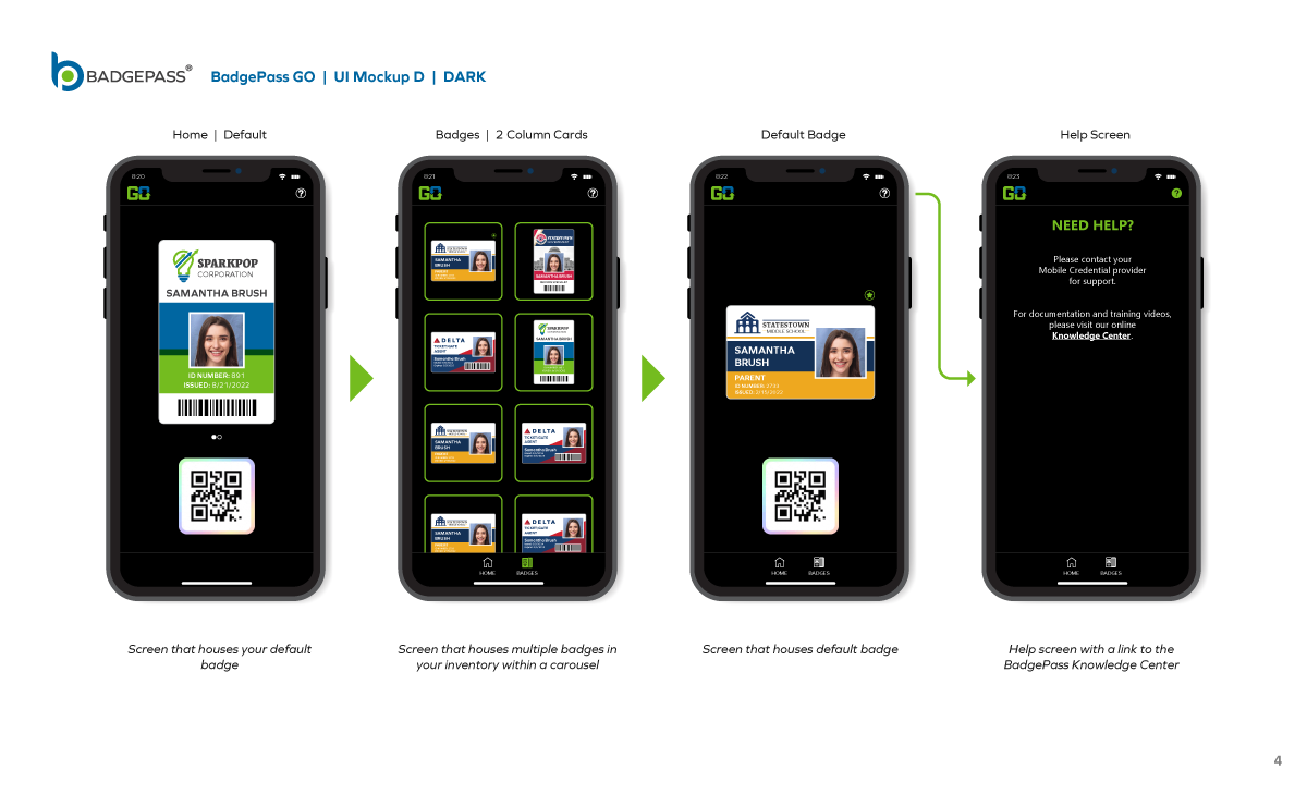 Results: Clean and contemporary mobile UI mockup, that consisted of the primary windows and navigation to efficiently get around the, app was created. It was a collaborative, back-and-forth process between myself, the product owners and the software development team, but we managed to finalize a layout for BadgePass GO.