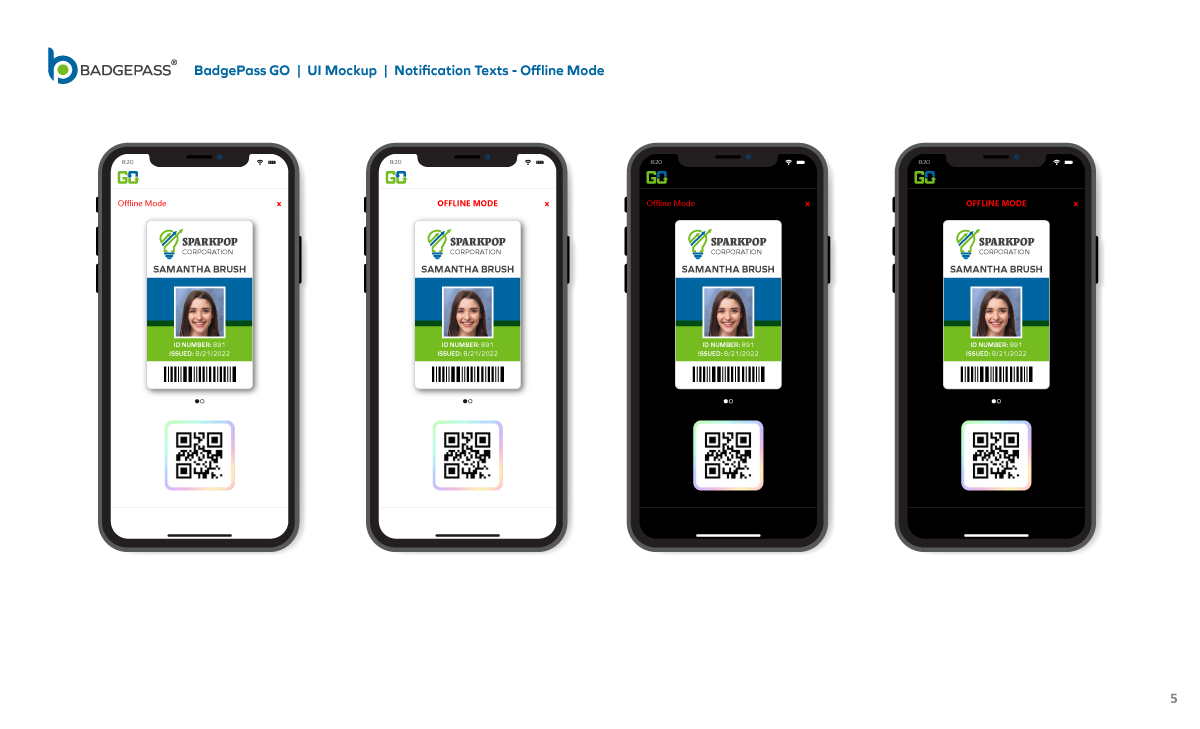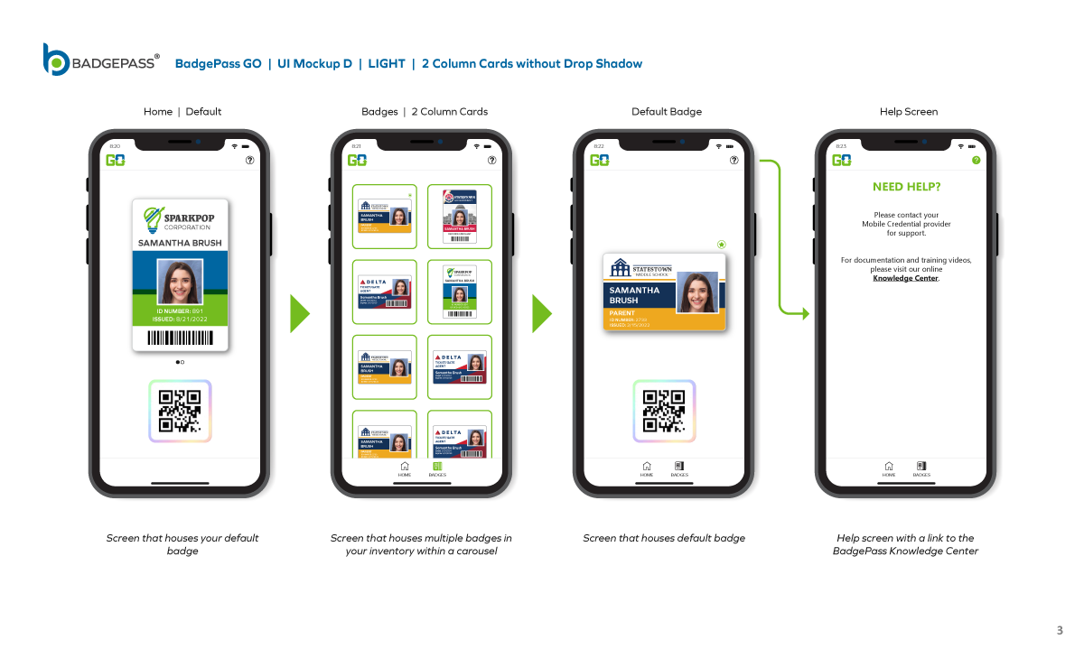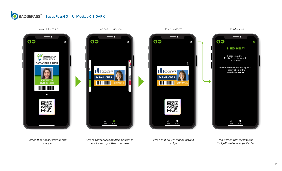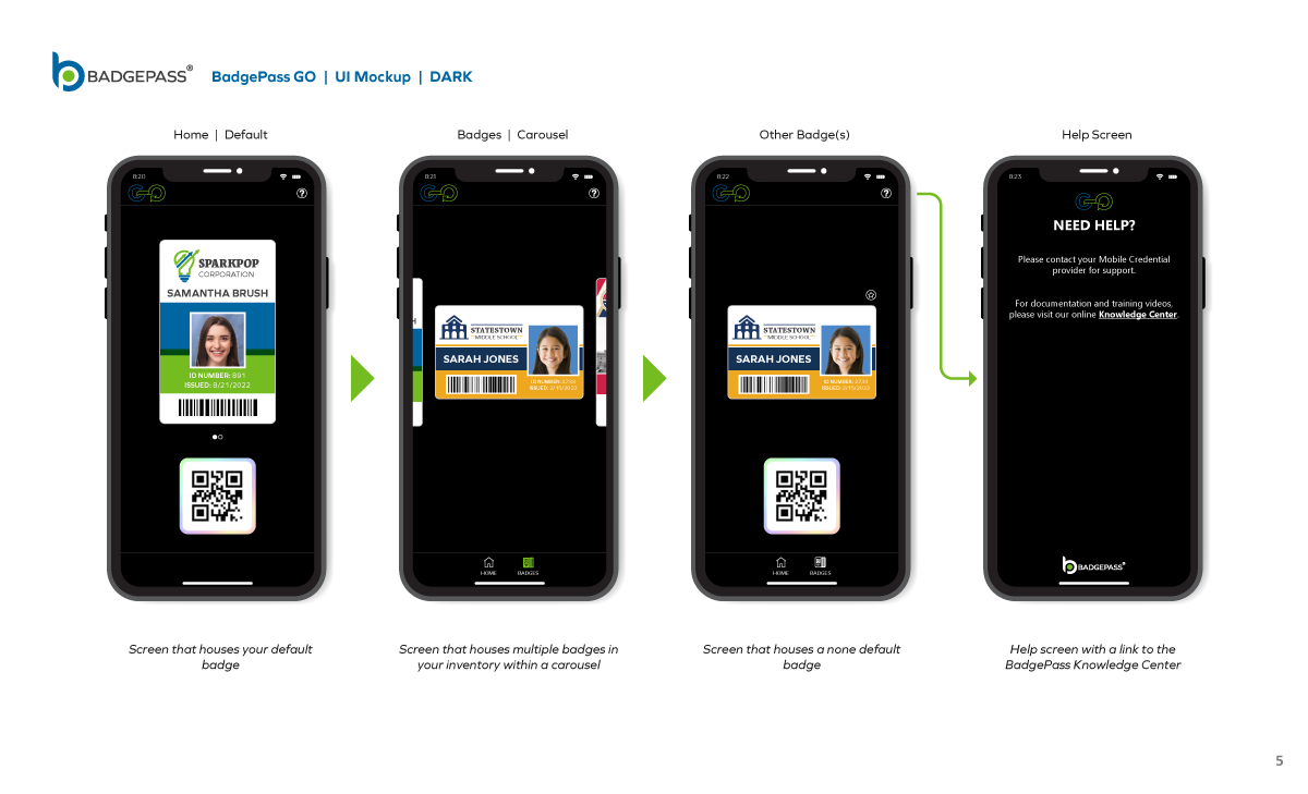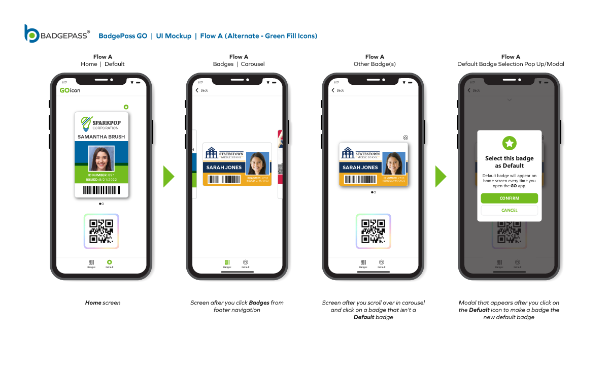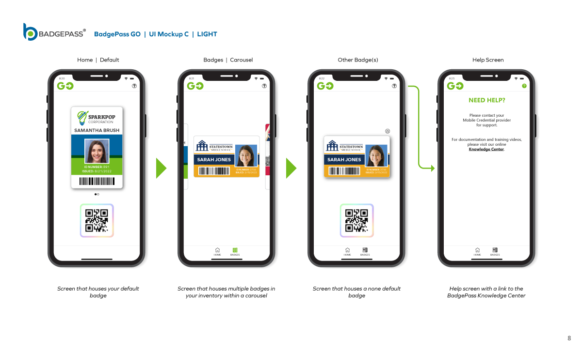 Results: Clean and contemporary mobile UI mockup, that consisted of the primary windows and navigation to efficiently get around the, app was created. It was a collaborative, back-and-forth process between myself, the product owners and the software development team, but we managed to finalize a layout for BadgePass GO.