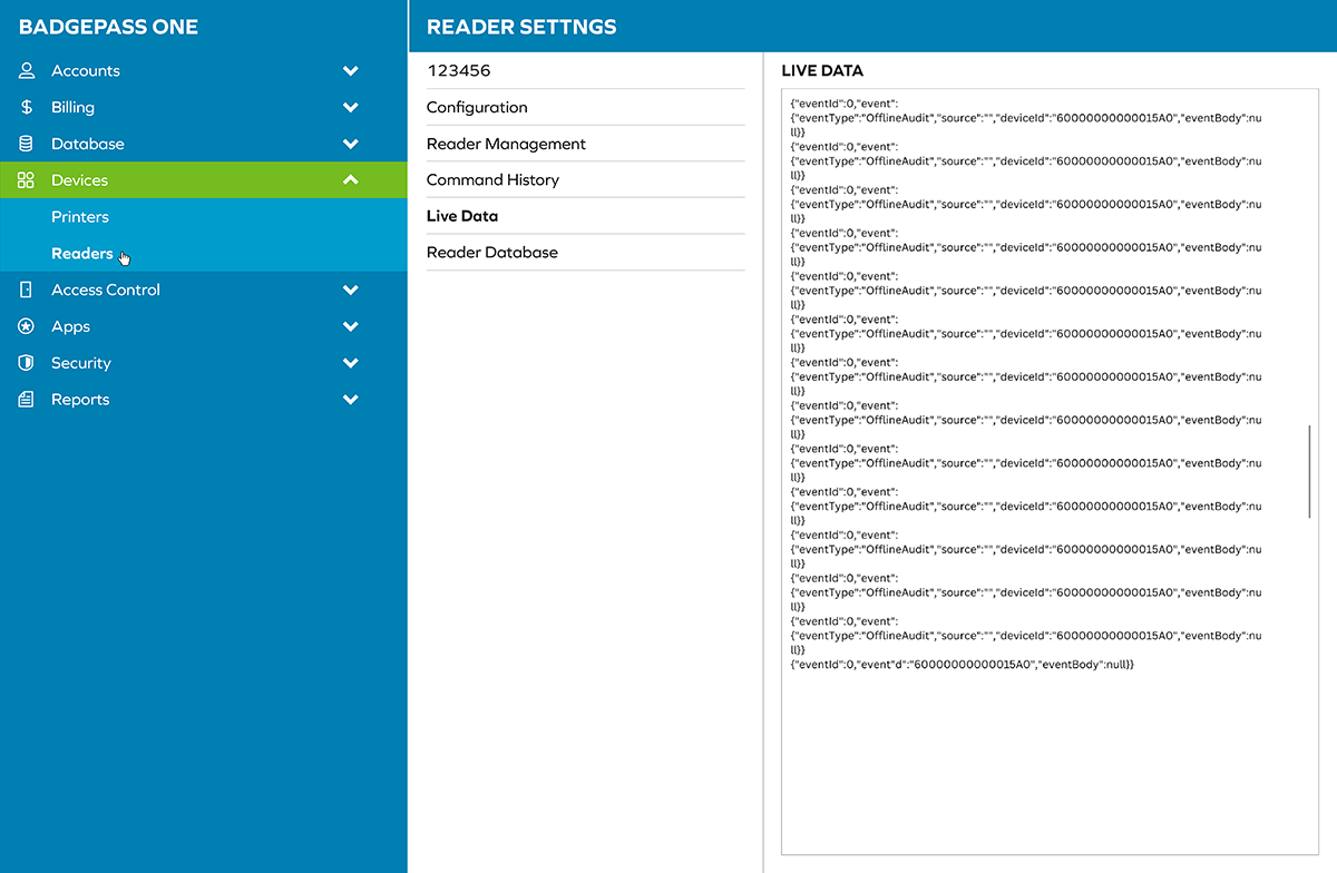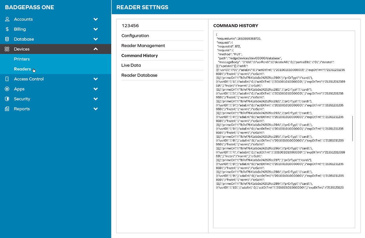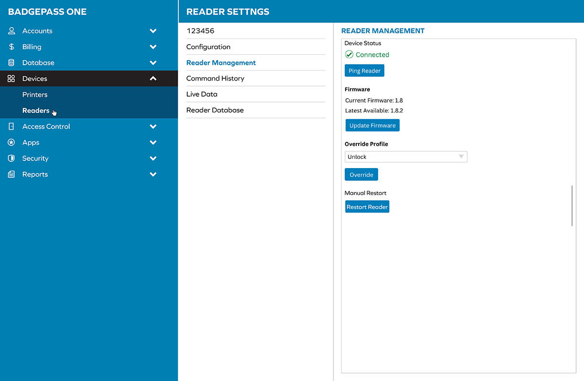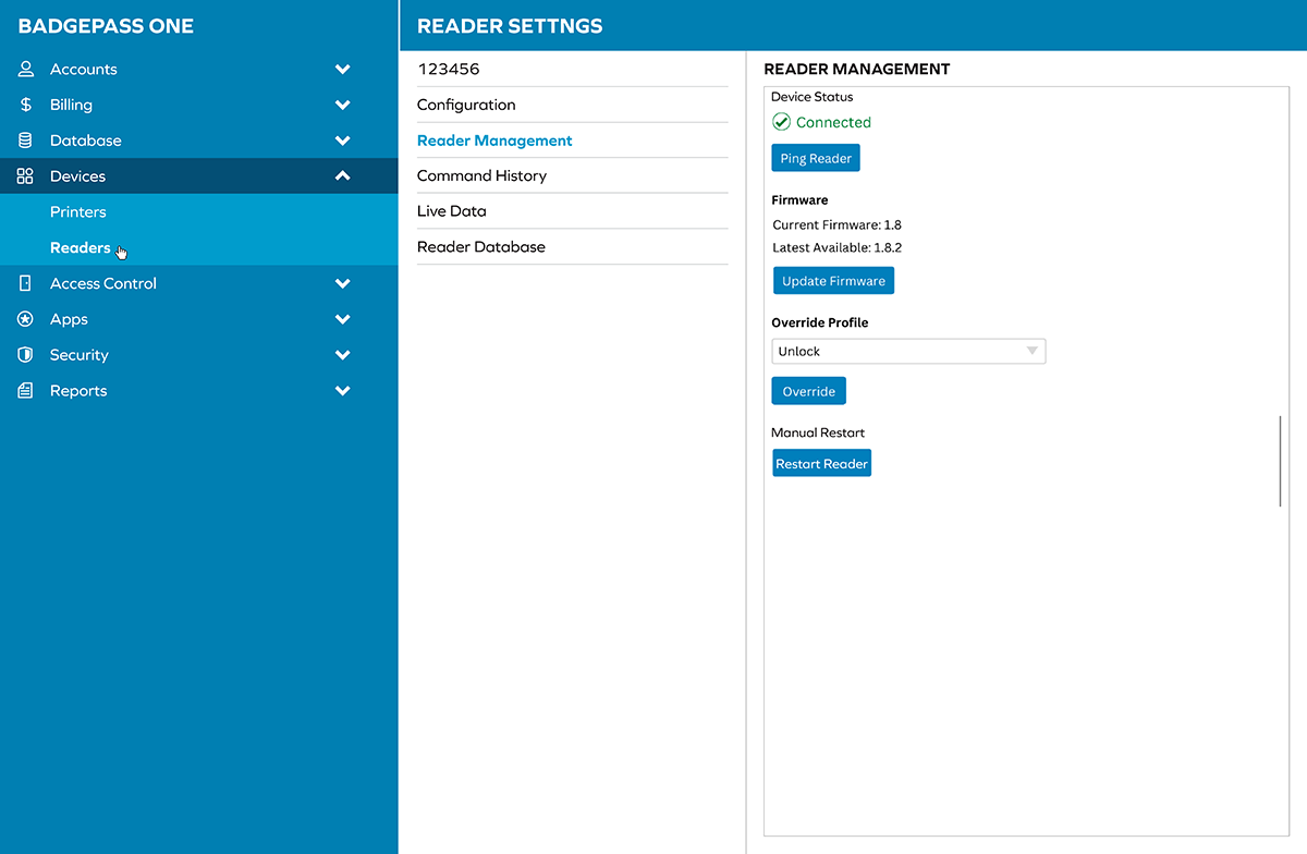 Objective: UI mockups for layout for the BadgePass ONE application’s portal. Collapsible elements and hoverable effects, settings and associated windows (Command History, Reader Management, Live Data, etc.) needed to be drafted.