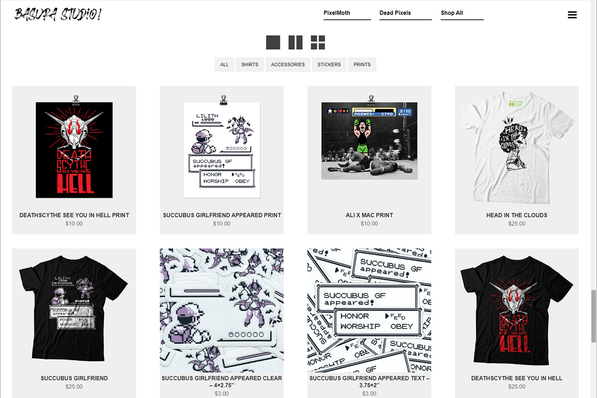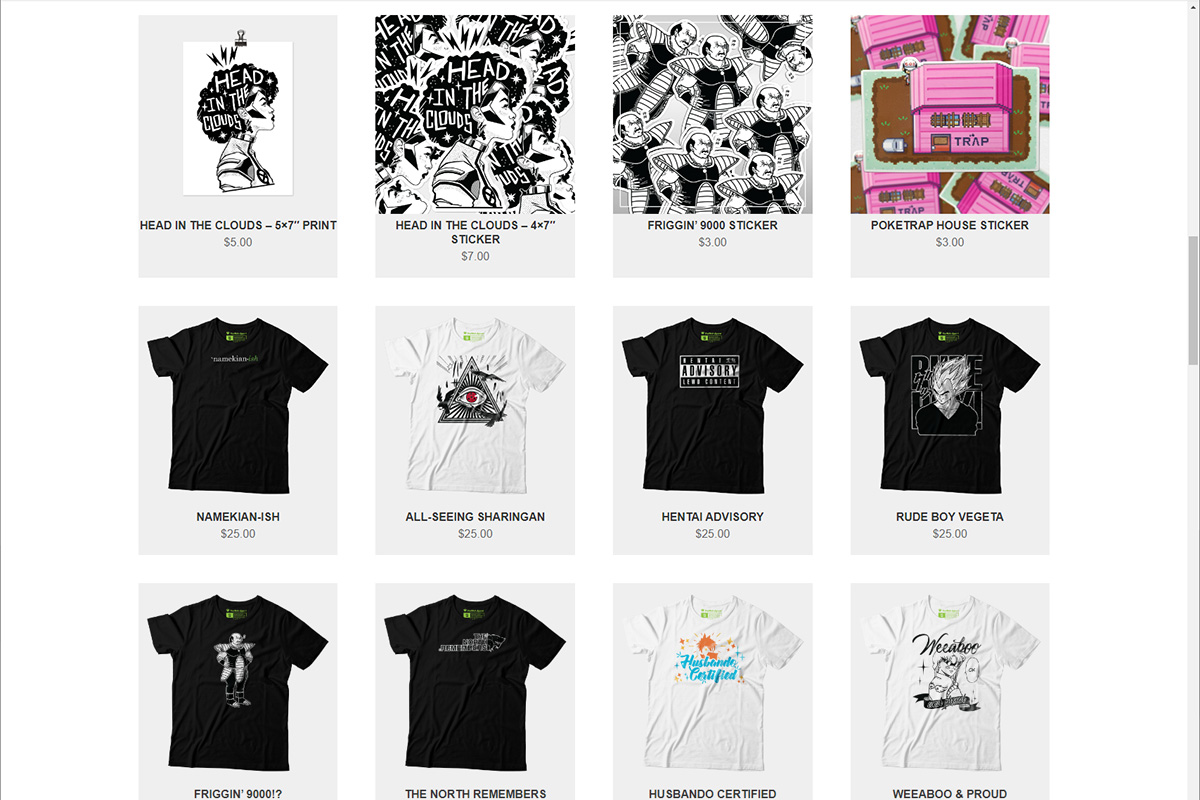 Objective: This is a personal project used as a creative outlet. The site started as apparel designs, that were a mashup of geek fandom (anime and video games), combined with an element of pop culture. I eventually added stickers and a few prints.