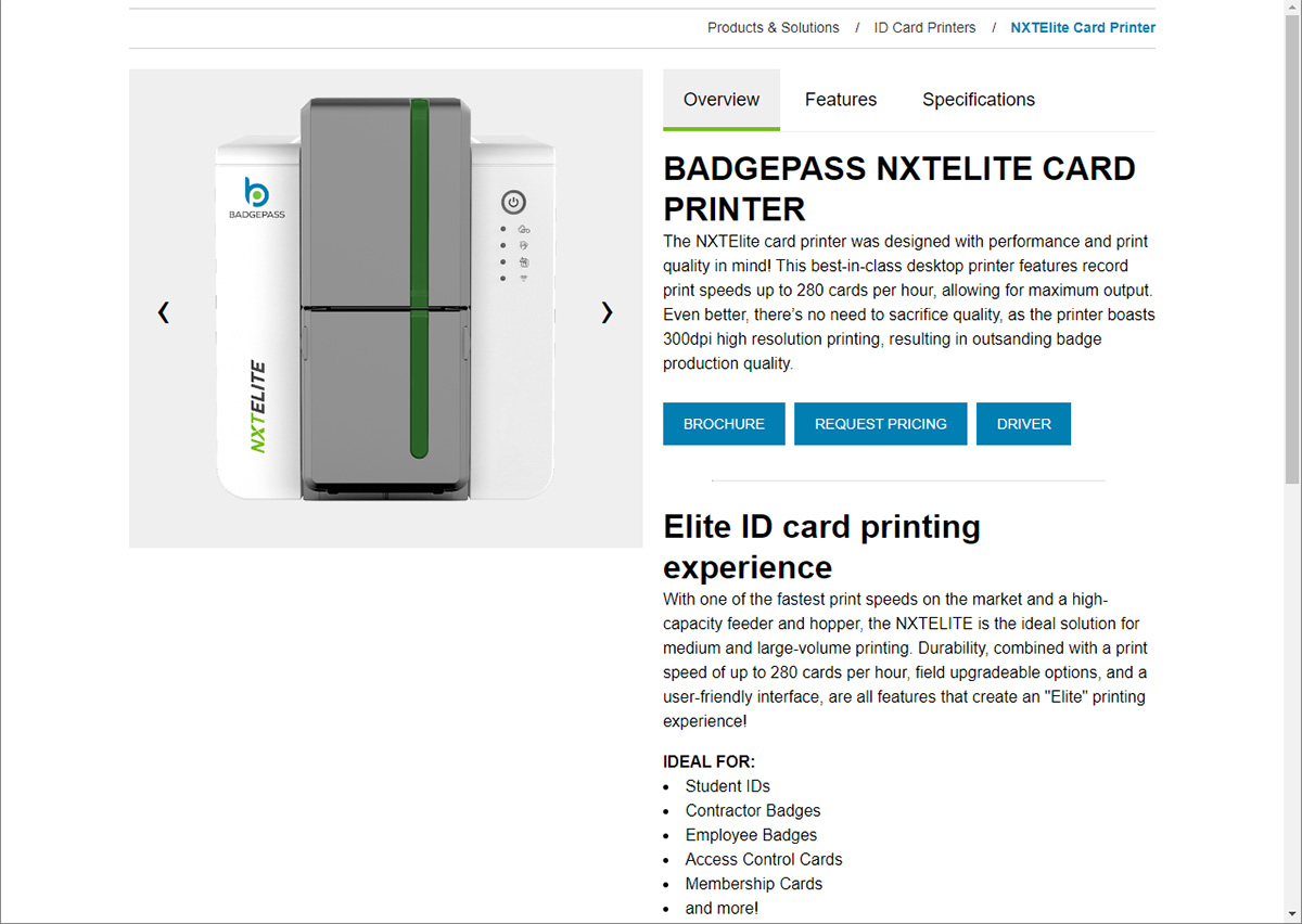 Page that has 2 columns with a sticky positioned image carousel in the left column, breadcrumbs and tabs. This was drafted for a printer product page.